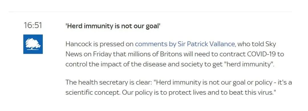 针对误读,英国卫生大臣作出澄清:“群体免疫”不是我们的目标或政策,它是一个科学概念”“我们的政策是保护生命和战胜病毒”。