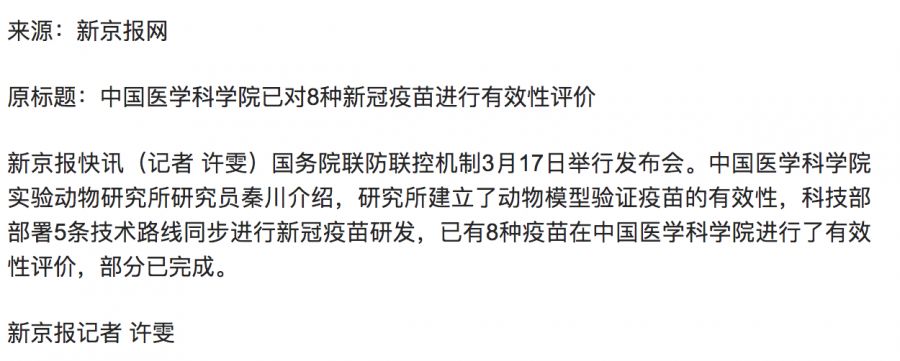 3月17日,中国医学科学院发布会表示,已对8种新冠疫苗进行有效性评价。