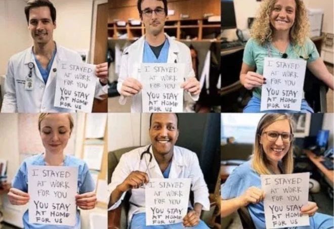 (“我们为了你们坚守岗位,你们为了我们留在家中”)