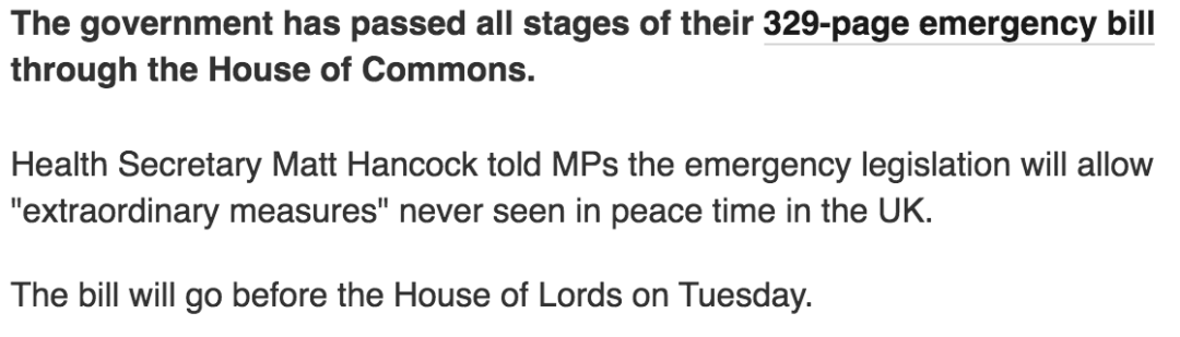 紧急法案涉及医疗、社工、学校、警察、部队等多个方面,长达329页,政府认为该法案对应对疫情蔓延至关重要。